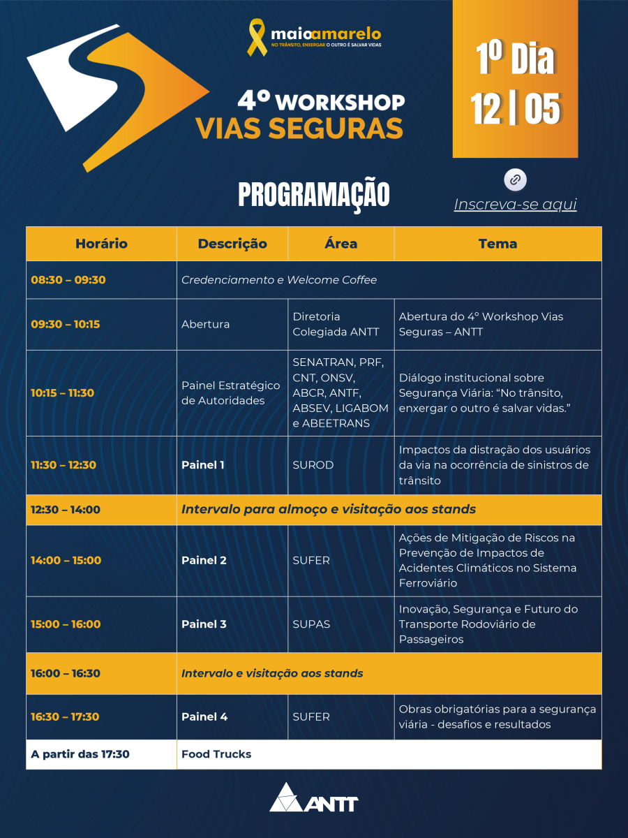 A Agência Nacional de Transportes Terrestres realiza o 4º Workshop Vias Seguras, com o apoio da ABSeV, ANTF, Melhores Rodovias do Brasil (ABCR), ABRATI, ANATRIP, ABEETRANS, CNT e o ONSV.