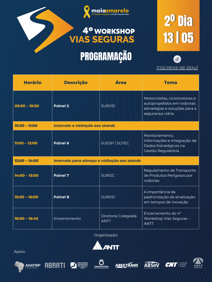 A Agência Nacional de Transportes Terrestres realiza o 4º Workshop Vias Seguras, com o apoio da ABSeV, ANTF, Melhores Rodovias do Brasil (ABCR), ABRATI, ANATRIP, ABEETRANS, CNT e o ONSV.