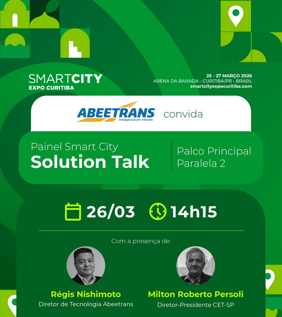 No dia 26, às 14h15, no palco principal – Paralela 2, teremos o painel Solution Talk, que tem como palestrantes Régis Nishimoto, diretor de Tecnologia da ABEETRANS e Milton Roberto Persoli, Diretor-Presidente do CET-SP, que foi convidado pela diretoria da ABEETRANS para participar desse momento. Além deles, compõem o painel também, Rodolpho Feijó, Relações Internacionais da Prefeitura de Curitiba, além de Paulo Humberto Cerchi Gouveia e Luiz Marcelo Padilha.